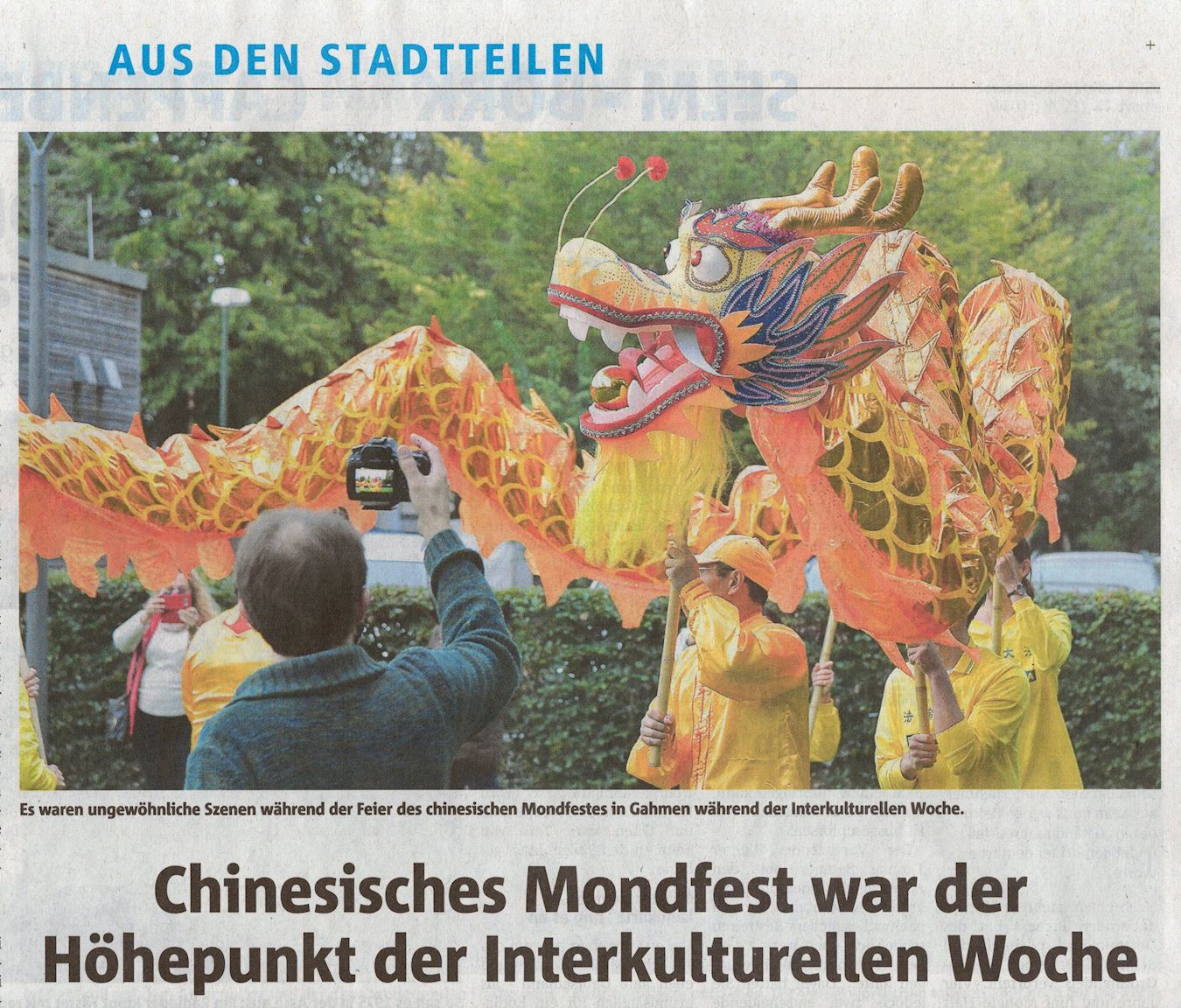 此次文化周的亮点之一是法轮功学员主办的中秋节活动,当地最大的报纸《鲁尔日报》在报道中说:中国的中秋节将国际文化周推向高潮。在文化周期间的中秋节是非常亮眼的一幕。移民专员阿德米博士说:“我们非常高兴,这次成功的将中秋节列入我们的计划。”