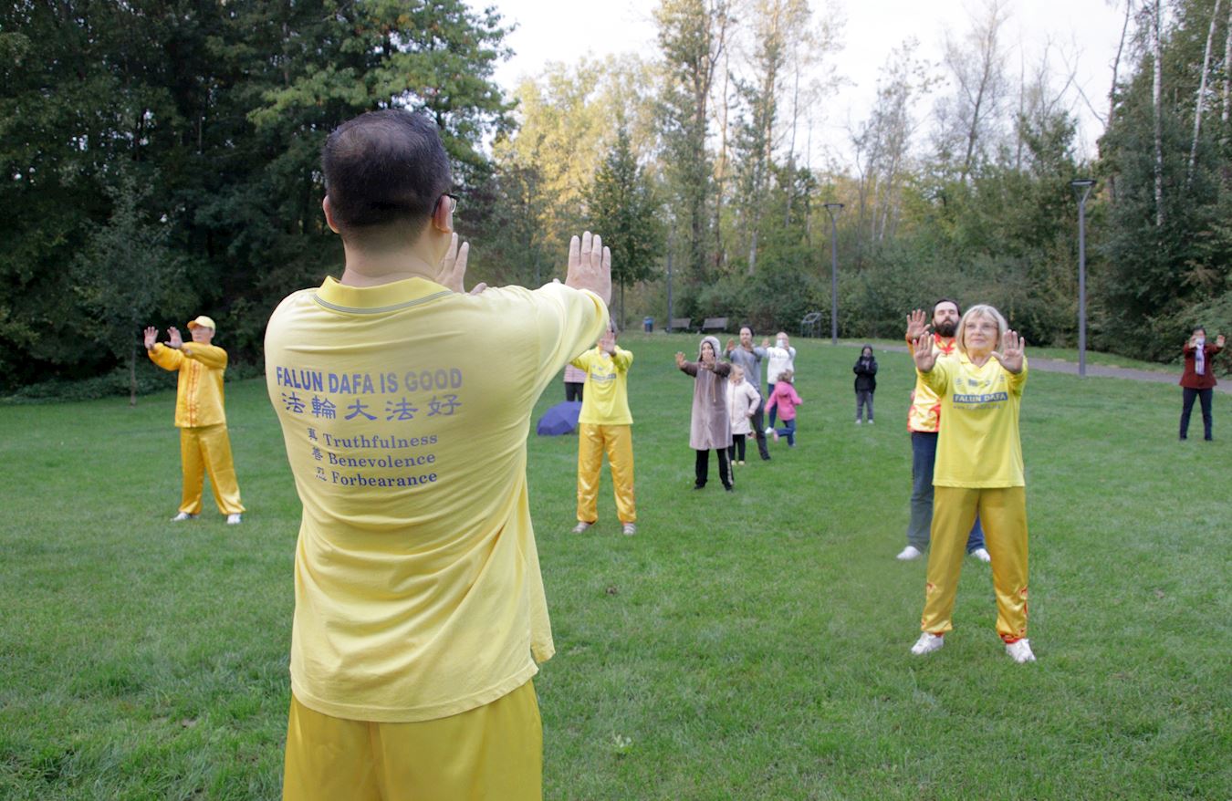 德国民众和法轮功学员一起共庆中秋节,此次中秋节的主题是:今夜我们都是中国人。由于疫情原因,庆祝现场的民众人数被限制在25人。舞龙之后,他们和法轮功学员站在一起,在祥和的音乐下体验来自东方的修炼功法——法轮大法。在疫情期间,健康变得非常重要,法轮功可以有效的解除疫情带来的压力和增强免疫系统。
