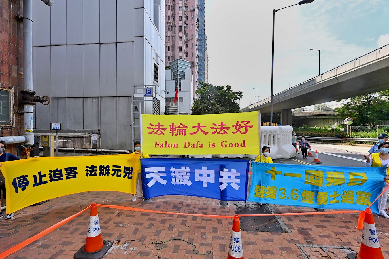 今年十月一日,中共与香港政府如临大敌,在全港部署超过六千警察,截查市民。中联办前更是被水马围住,市民无法接近。在四人限聚令下,数名法轮功学员四人一组,由西区警署游行至中联办。在中联办门前,法轮功学员举起“法轮大法好”、“天灭中共”、“十一声援3.6亿勇士退党”的标语。