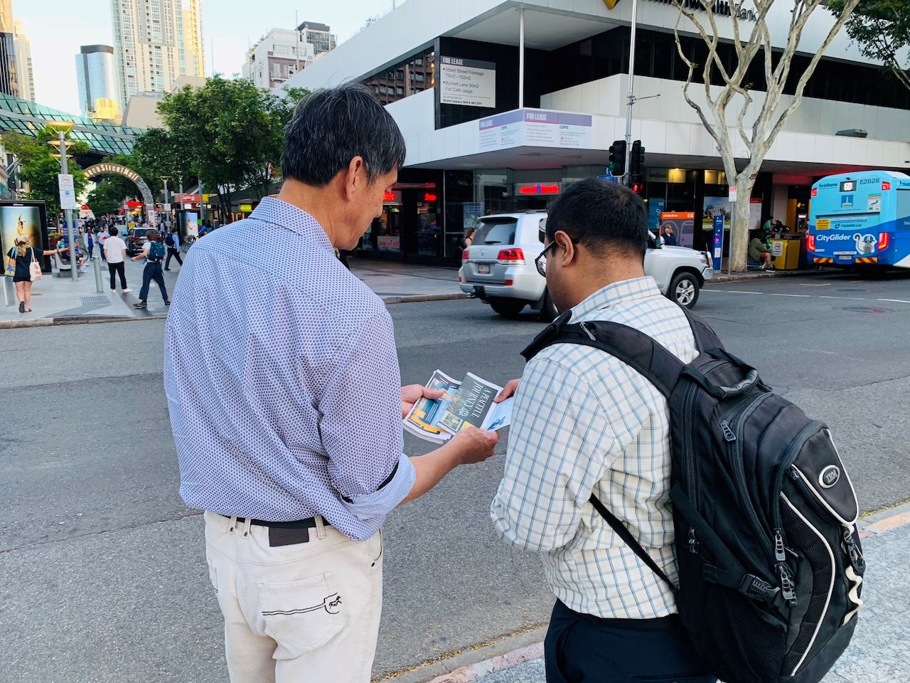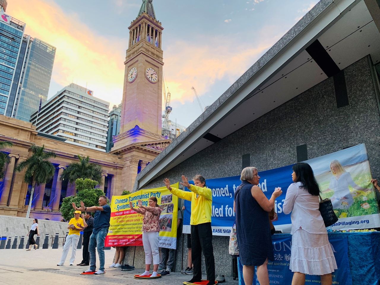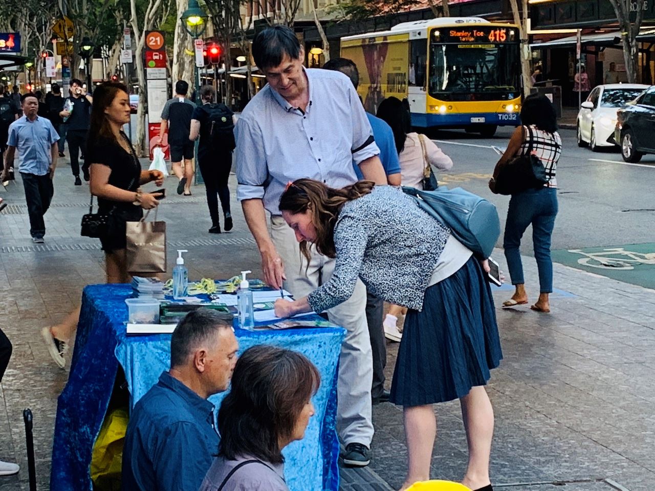 该活动在每两周的周五举办一次,于下午四点三十分开始,正迎合广场对面女王街购物中心(Queen Street Mall)的民众购物高峰期。醒目的法轮功真相横幅和真相展位聚焦民众的目光,有的人主动前来询问详情;有的人大老远就竖大拇指对学员们表示赞许;有的人主动过来在展位上签字表示支持反迫害;还有人主动帮助法轮功学员向路人征签的。