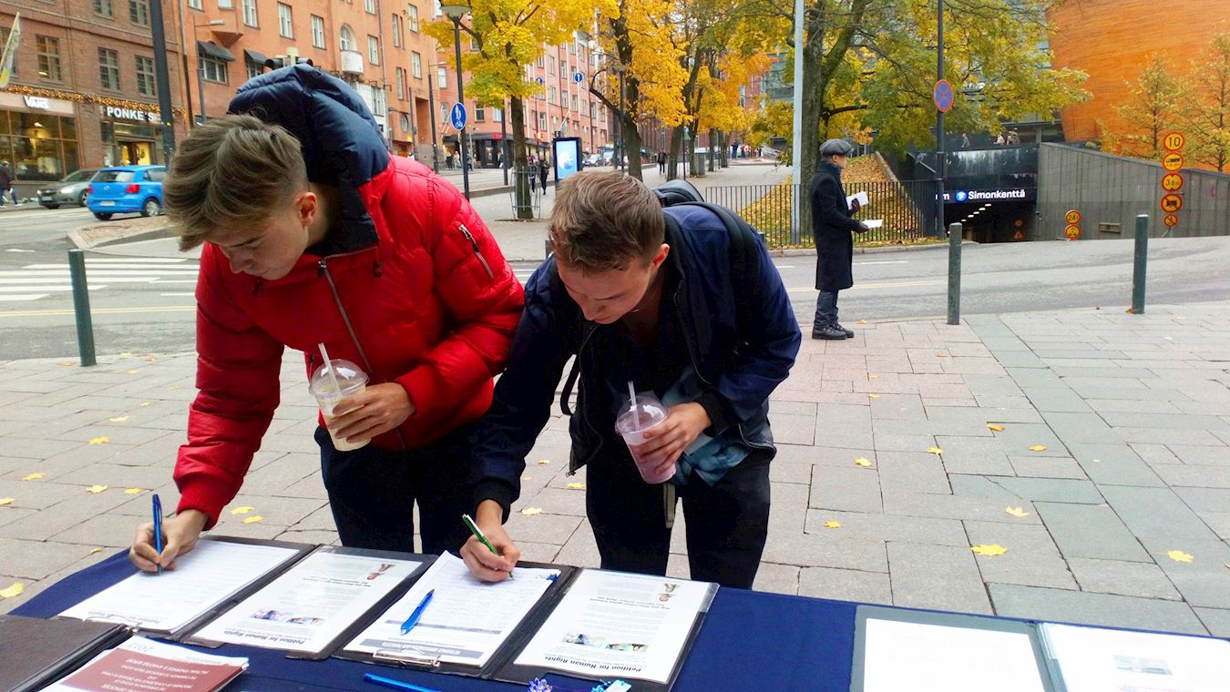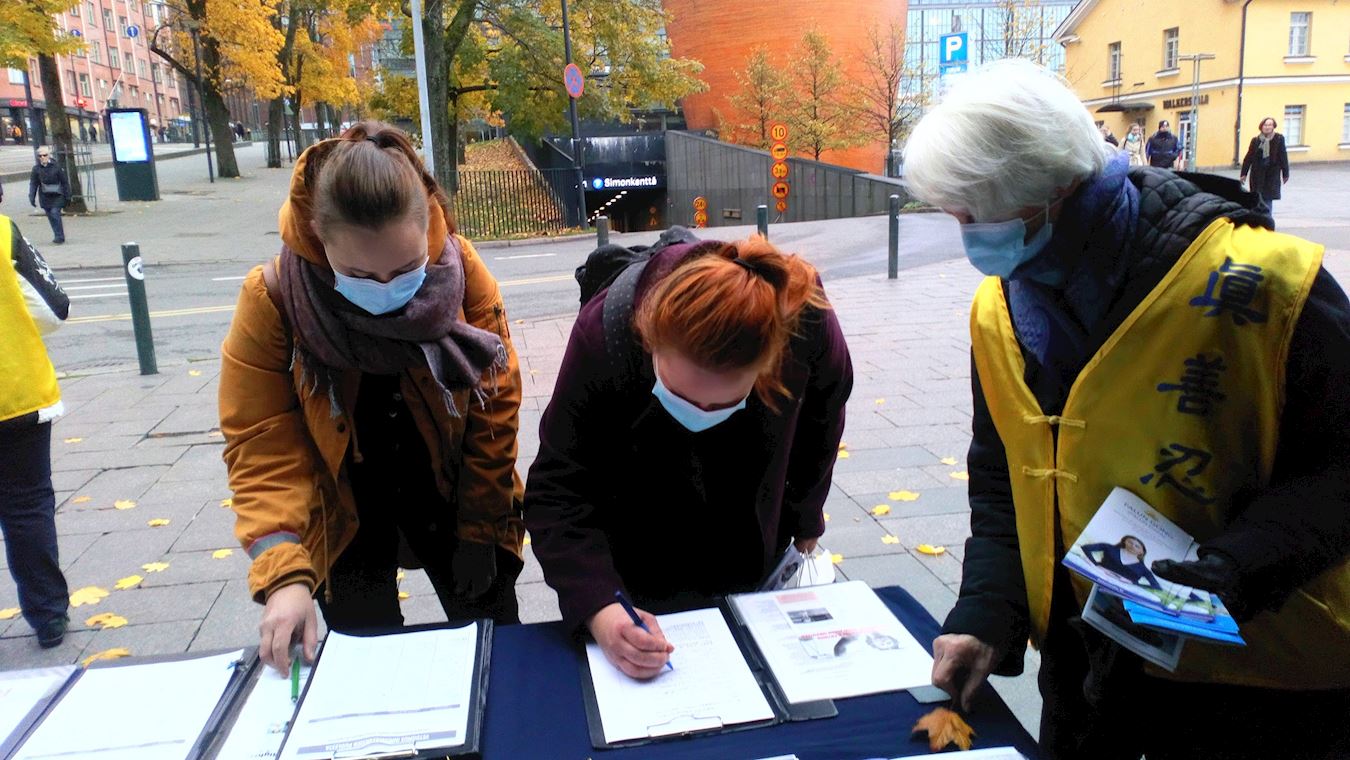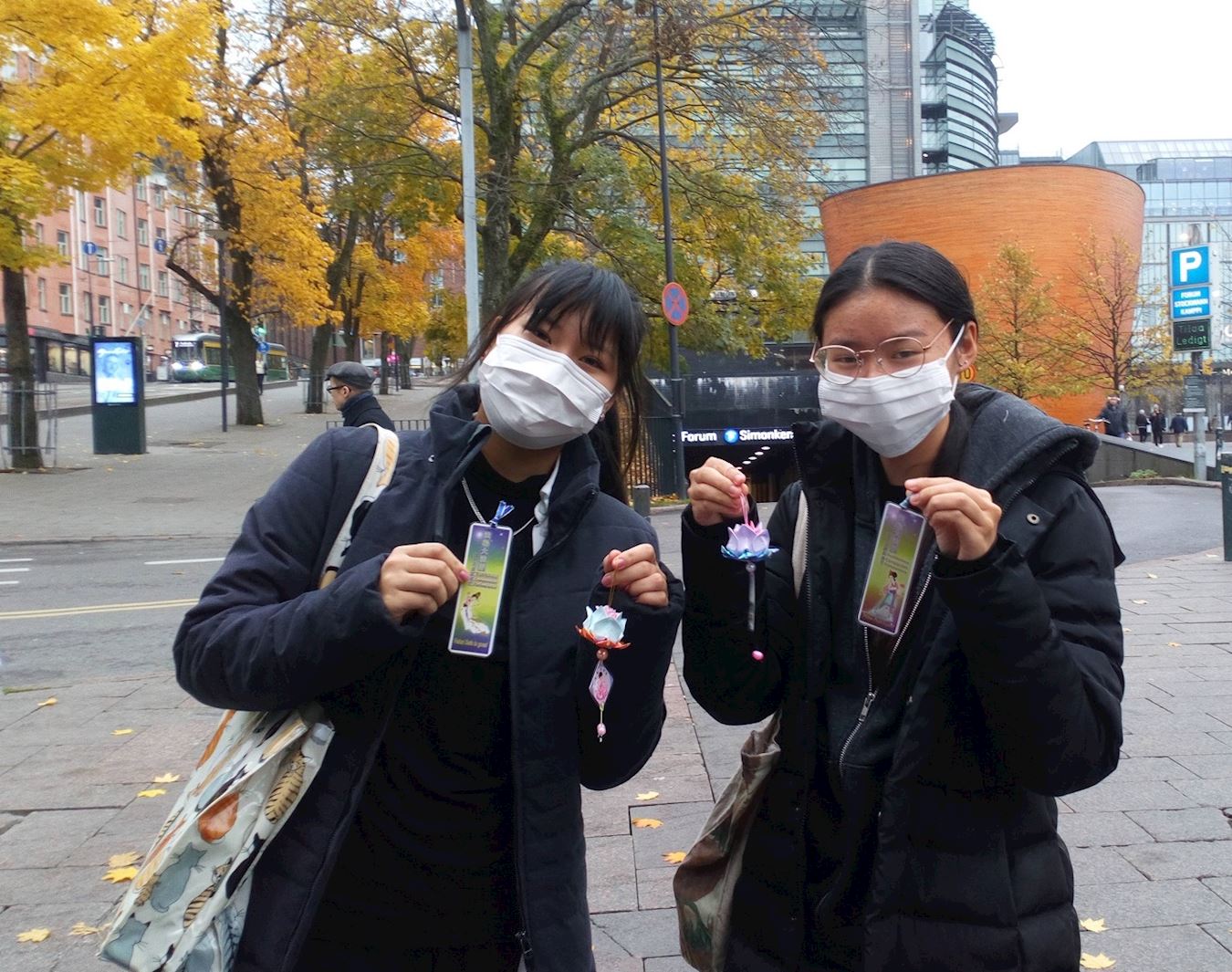 学生吉雅(Kiia)和米拉(Milla)在远处看见帐篷上写着“为人权征签”,就过来签名支持。吉雅喜欢中国的文化,并上过中文课。学员送给她们手折的莲花时,她们高兴地用中文说:“谢谢!很漂亮!”