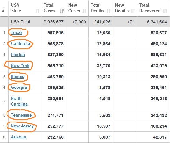 Worldometer.com的数据显示出,受中共病毒感染最严重的10个州中,7个(表二中7红圈)来自中共智库报告中对华贸易前10名。