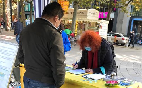 法轮功学员递给她活摘器官的传单,问她愿不愿意签名,做出道义上的支持,读完传单,古奇女士很快的拿起笔签了名,她也招呼身边的儿子:“你也可以过来签名。”