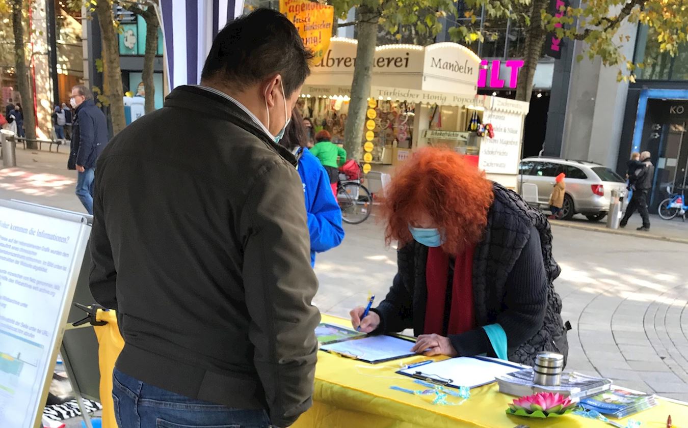 当古奇女士(Gutsche)和儿子看到信息台桌子前面的横幅“请签名制止活摘法轮功学员的器官”,禁不住停下脚步,认真阅读起展板上的信息。