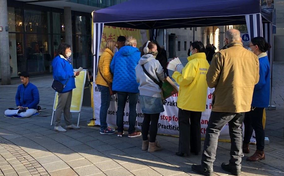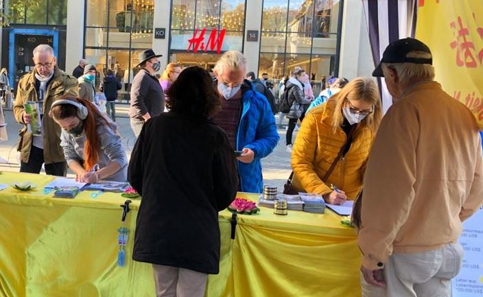 德国小伙子扬(Jan)主动走到信息台签名,法轮功学员问他是否知道为什么签名,他说:“横幅上不是写的很清楚吗?”学员说:“写的是很清楚,我再给你一份传单,上面有更详细的信息。” 扬认真的收好传单说:“这样的事(活摘法轮功学员器官)不应该发生!”