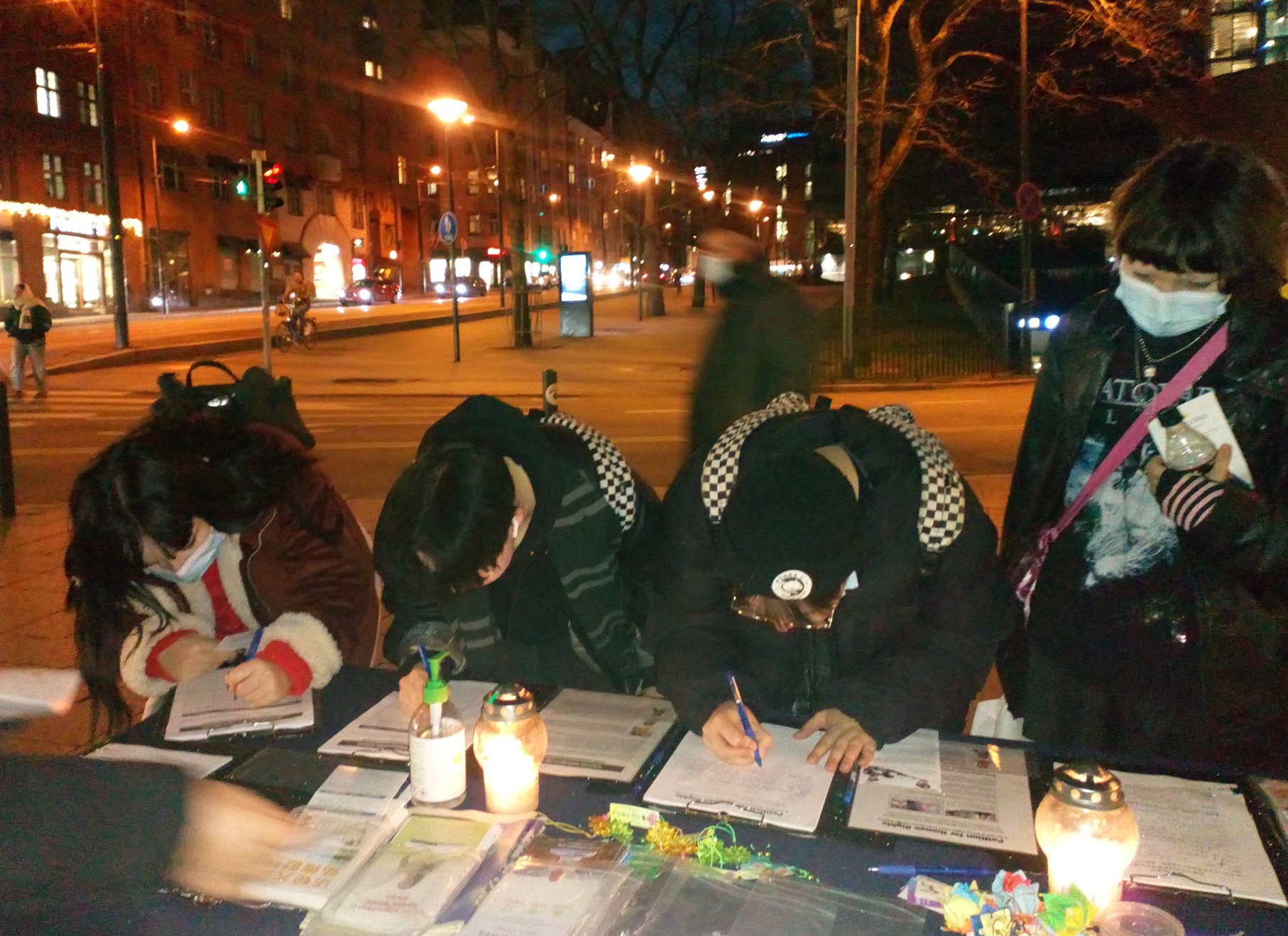 下午三点至六点,学员来到赫尔辛基甘比购物中心外烛光夜悼,并通过演讲向路人介绍法轮大法教人按照“真善忍”做个好人,弘传世界一百多个国家和地区,却遭到中共非法关押,酷刑折磨,甚至被血腥杀戮。