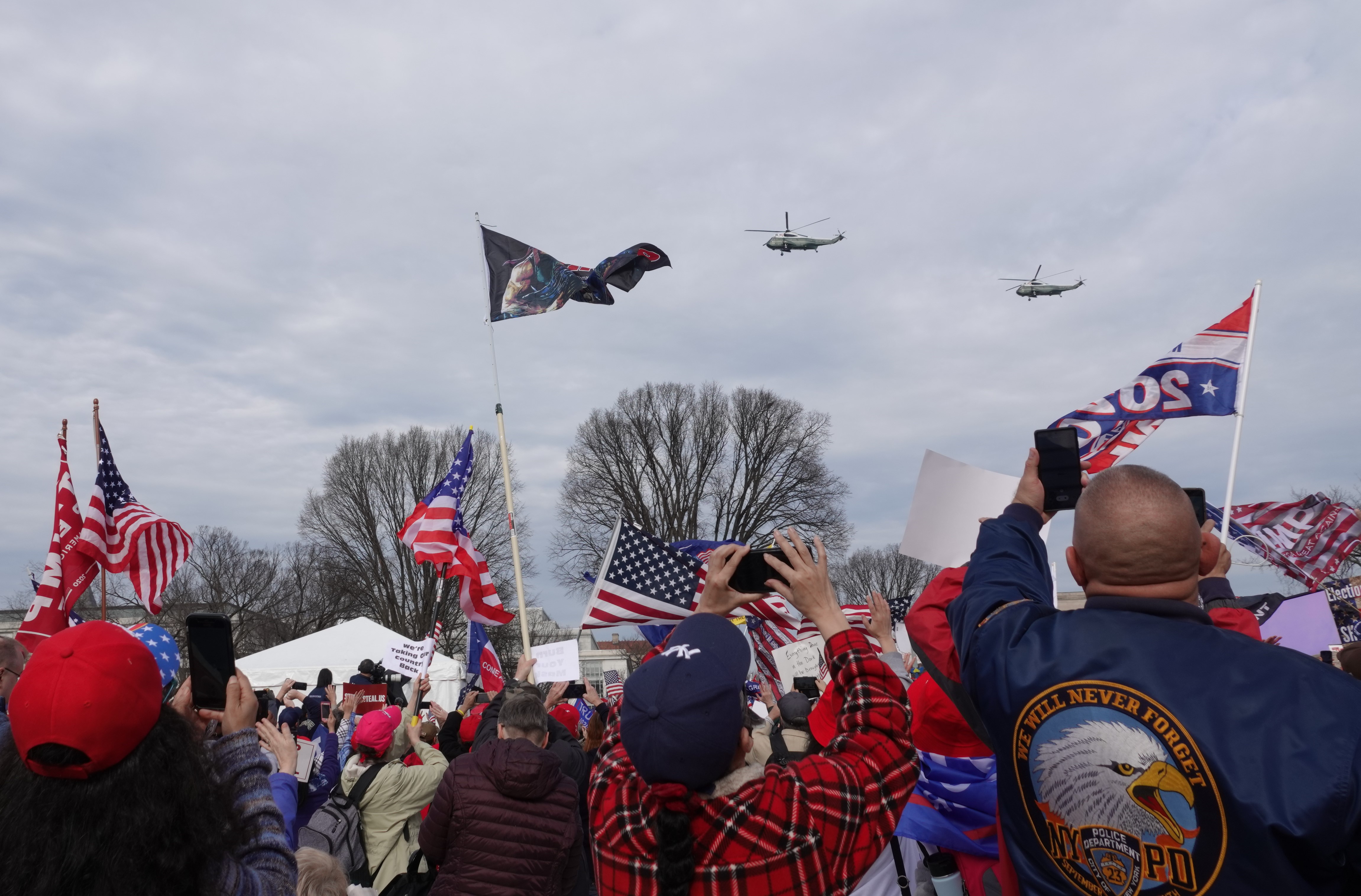 图4:在弗林将军演说过程中,总统海军陆战队一号环绕自由广场上空飞过,并环绕数圈,人们兴奋地欢呼,挥舞国旗致意。
