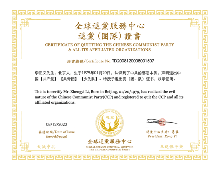 详情及在线办理“退党证书”可登陆:https://www.tuidang.org/