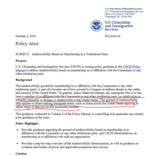 10月2日,美国公民及移民服务局(USCIS)在其政策通知中说,基于共产党或其它极权政党、或隶属共产党或其它极权政党组织的成员身份,其申请均不予受理。移民局称,不予受理的理由是美国国会通过的一系列旨在解决美国的安全威胁和防卫法律的一部份。