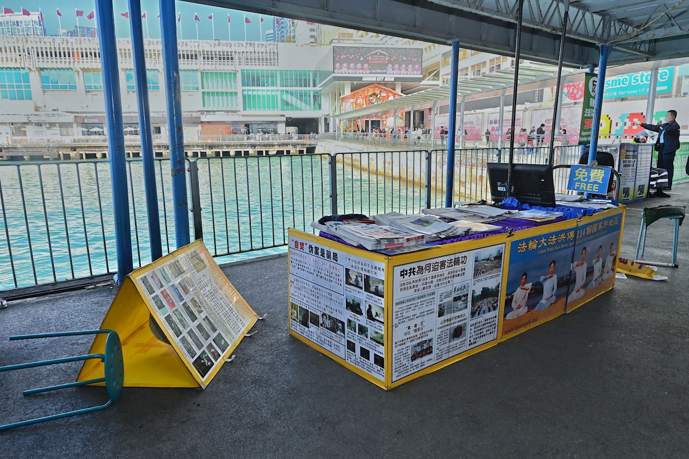 十二月二十日中午十二点左右,在尖沙咀码头旁的真相点,法轮功学员陈女士正在炼功之际,感到后边的展板倒地,以为是风大,把展板吹倒了,查看之下发现原来又是中共黑帮分子正恶意将展板从右边一直推倒到左边,并将展板扔到海里。