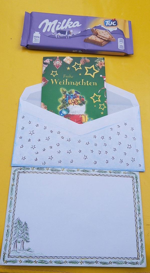 ![]() 图3:在信息台前,一位德国女士签名之后,送给法轮功学员她自己绘制的圣诞卡与巧克力。 |