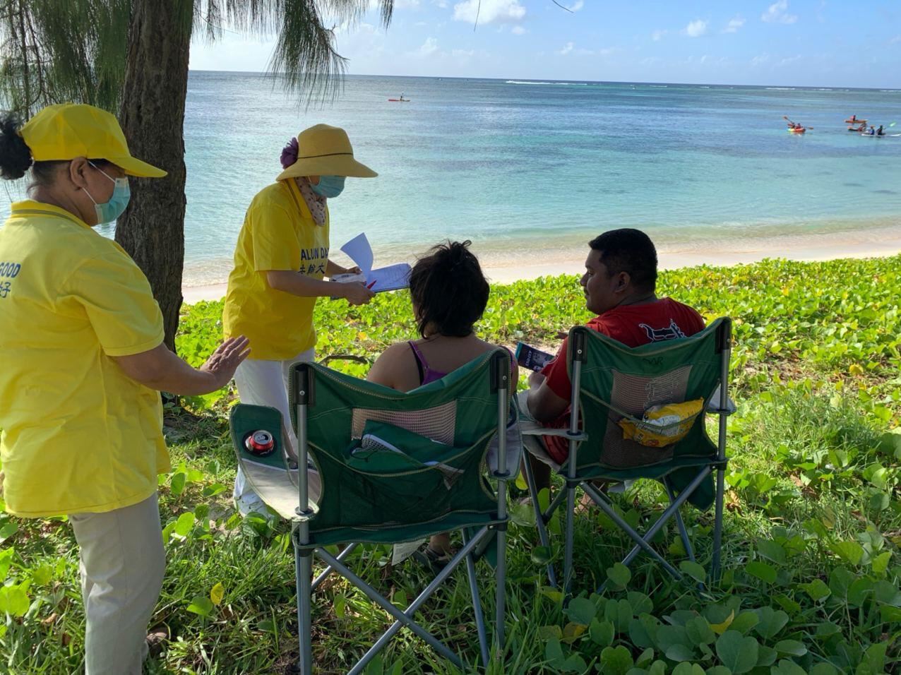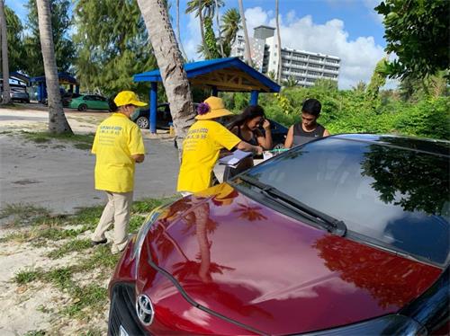 【明慧网二零二零年十二月二十七日】自二零二零年十一月中旬以来的每个周末,塞班岛“传递法轮大法真相”车队游行已历时一个多月,征签活动已近四个月。塞班岛土著居民既纯朴又善良,二十多年来塞班岛学员们坚持弘扬法轮大法,人们对法轮大法的祛病健身功效和“真善忍”的普世价值纷纷表示支持与赞美。土著居民用各种方式鼓励与赞美游行车队,有招手示意的,合十的,有静静地鞠躬看着车队缓缓驶过的,有鸣笛的,有竖大拇指的,有因看到了车队游行想学炼功法的。