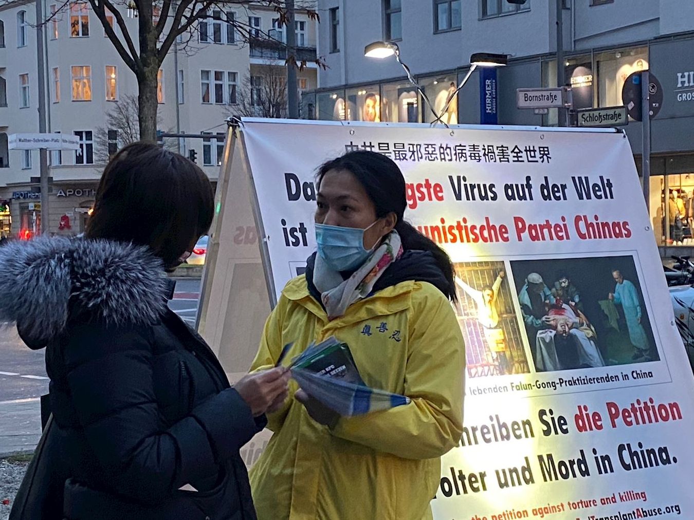 柏林人格西(Gerch)先生是搞政治研究工作的,他说:“我在媒体上听说过法轮功。我是政治学家,我觉得我们得让中共知道界限在哪里。我觉得中共对全球越来越明目张胆地控制,想起领导作用,这非常危险。他们想把他们的(共产主义)系统在全球得以推行。我签字支持反迫害,我觉得人还是应该为自由抗争。看看香港就是好例子,我们不能退缩不能放弃,因为这是对的做法。”
