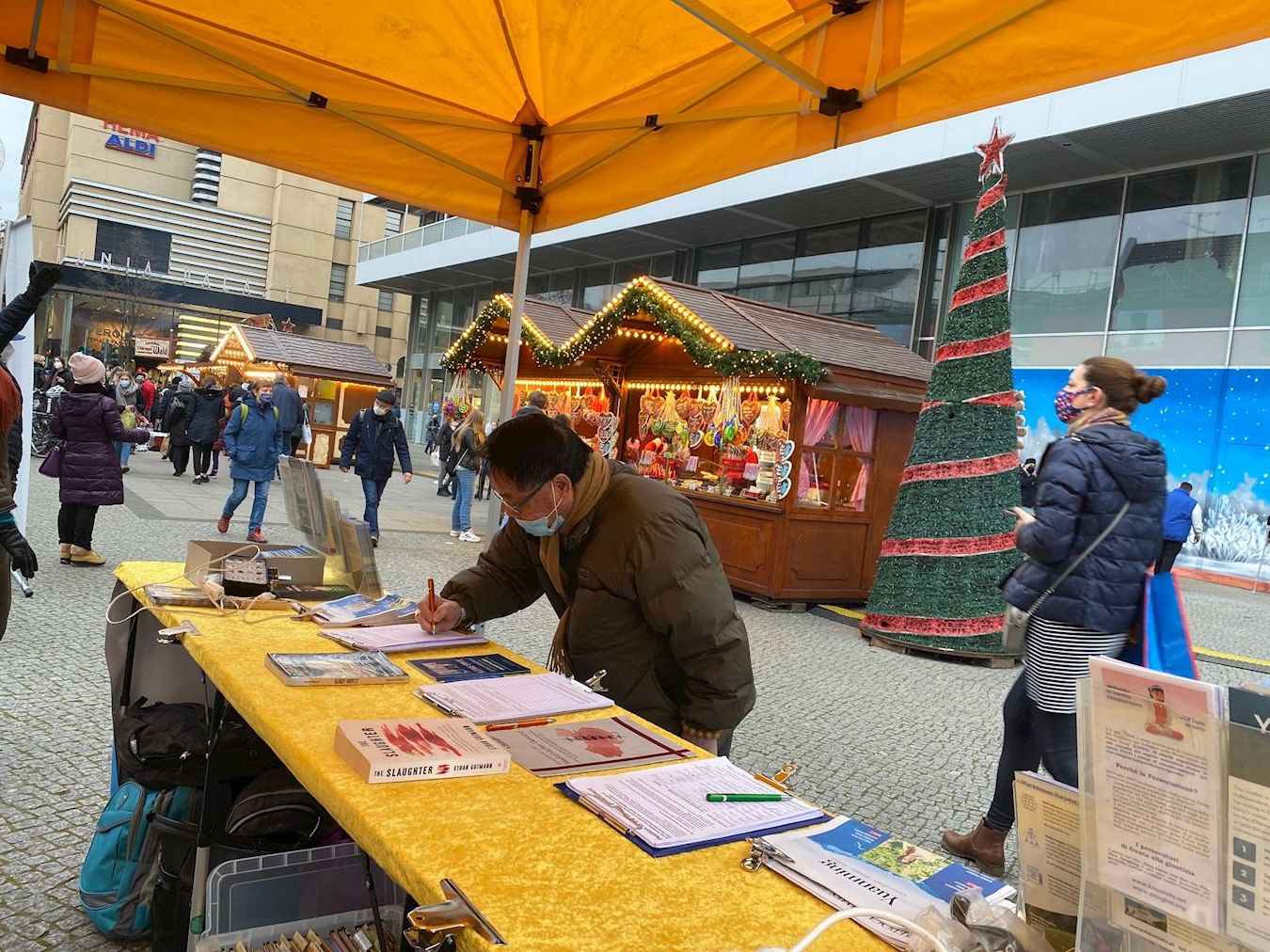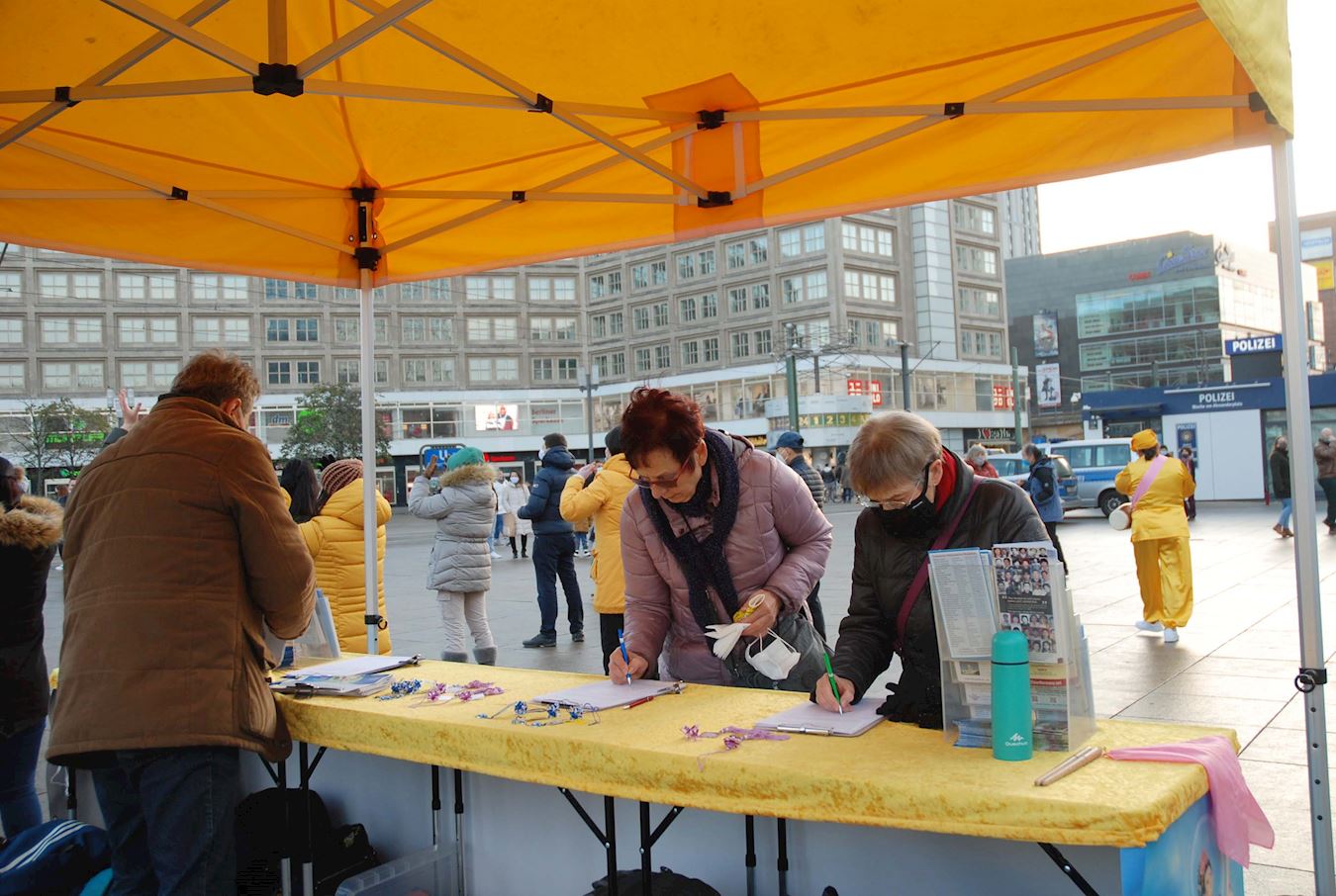 ![]() 图7:二零二零年十二月六日,布拉曼(中)和李斯特(右)女士一起在柏林亚历山大广场,为停止迫害签字。 |