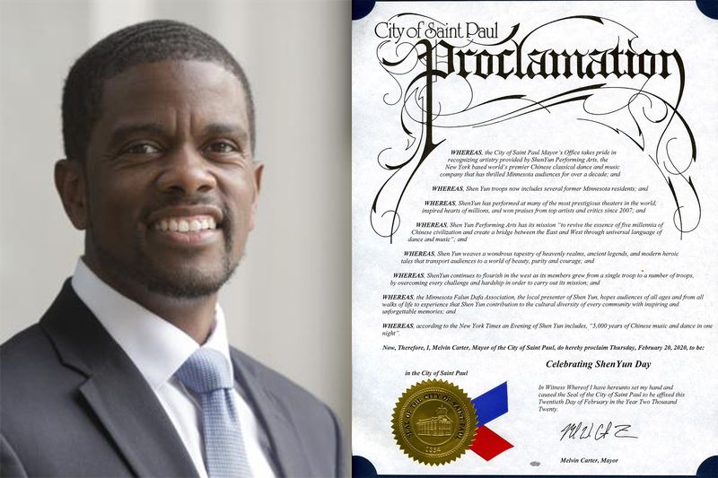 ![]() 图4:圣保罗市长梅尔文·卡特(Melvin Carter)在首演日给神韵颁发褒奖,将二月二十日订为“庆祝神韵日”。 |