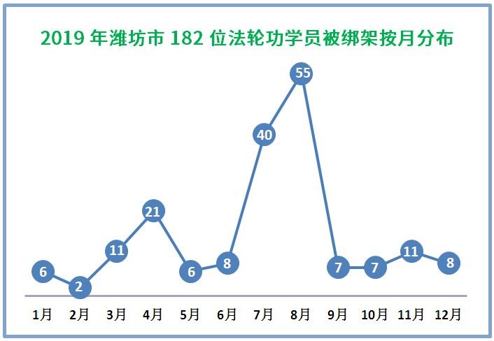 ![]() 图3:2019年潍坊市182位法轮功学员被绑架按月分布 |