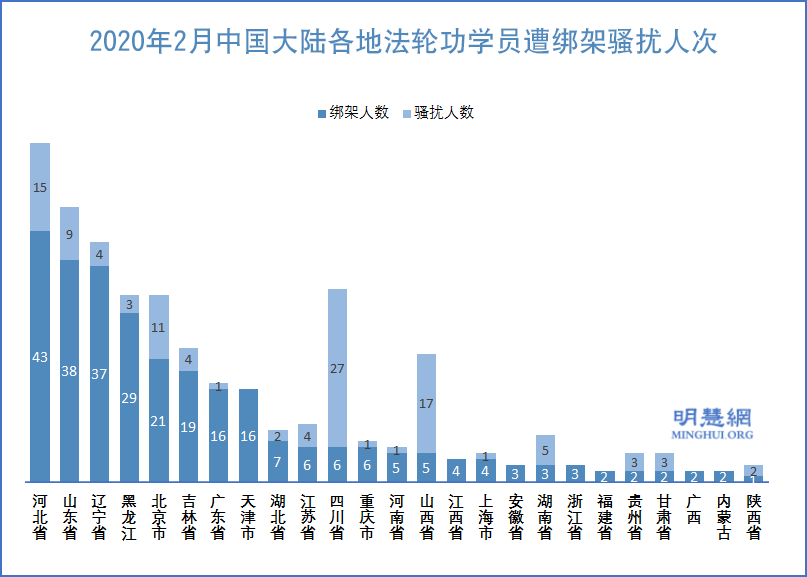 ![]() 图2:2020年2月中国大陆各地法轮功学员遭绑架骚扰人次 |