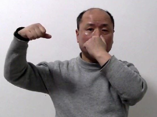 勒的就是手腕那种,背铐,就像这样,勒的非常紧,非常难受。胳膊、手、手腕,后来这个手腕,当时就是说,现在看不出来了,当时手腕都是勒出,勒破了,这个可能还有点,剩下这个伤痕(见下图,视频截图)。