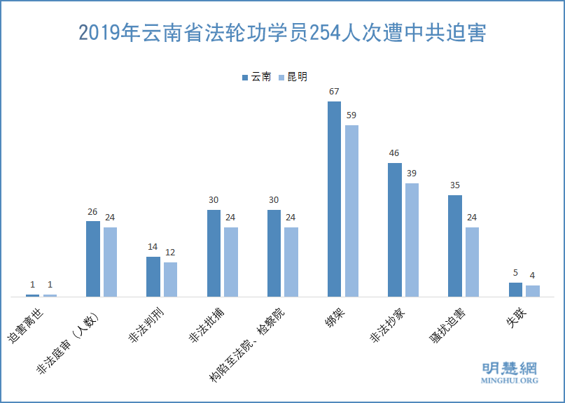 根据明慧网2019年全年的资料显示,2019年云南法轮功学员有254人次遭到中共迫害。