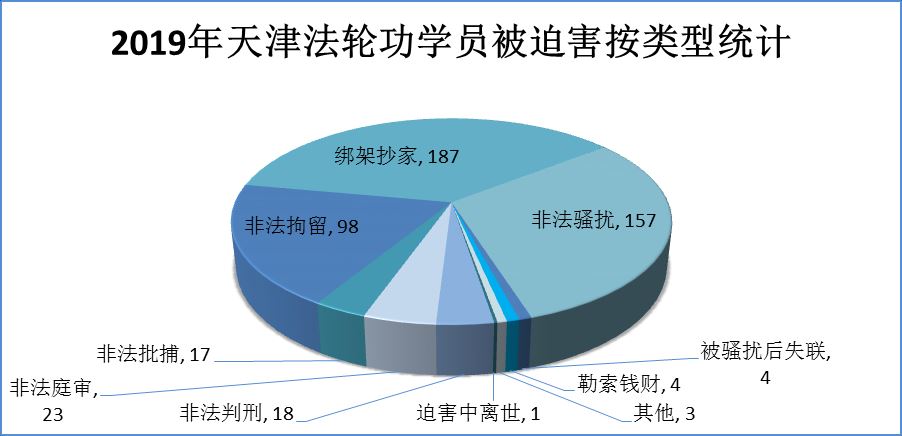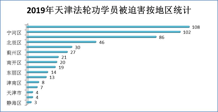 迫害比较集中的区域有:武清区108(人次)、宁河区(102人次)、滨海新区(88人次)。由于中共的信息封锁,更多的迫害案例无法详细统计。另悉,2019年报道前期案例:迫害致精神失常1人。