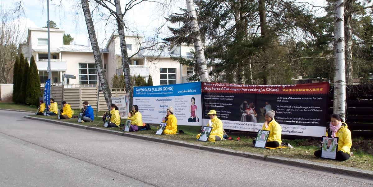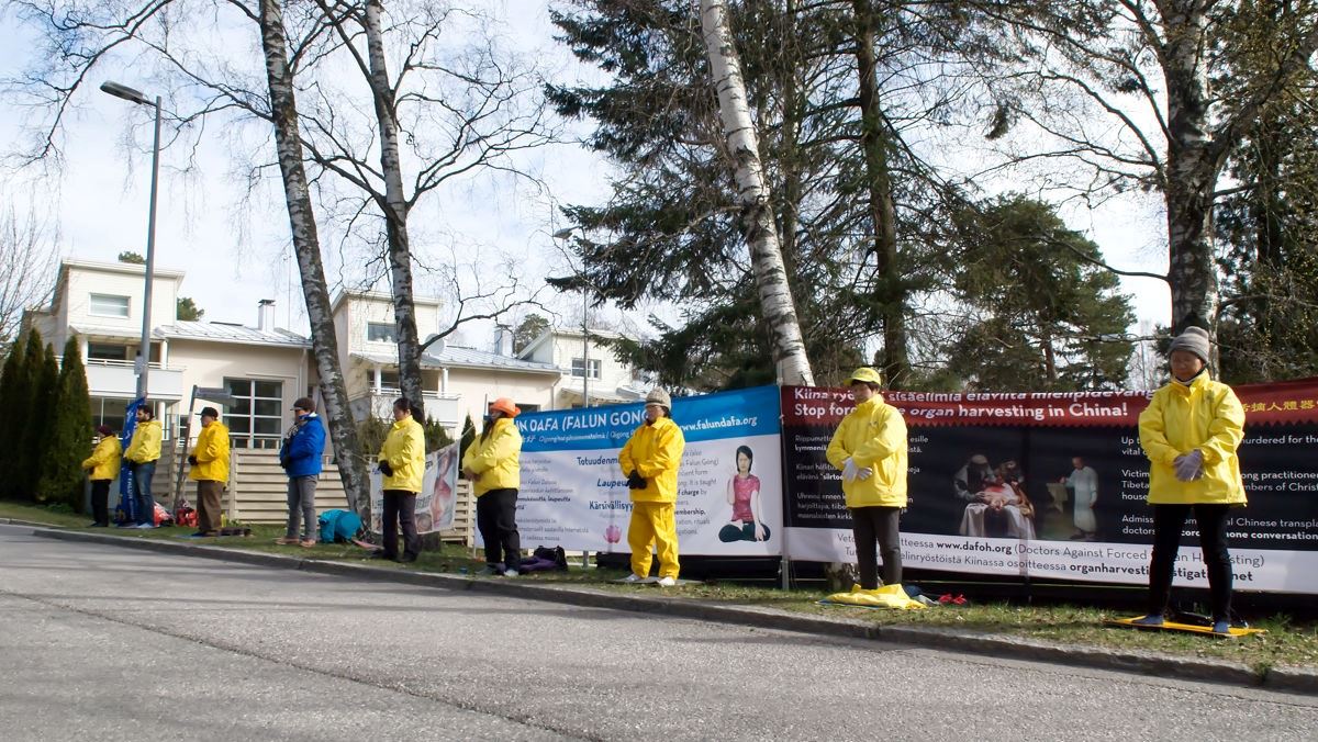 ![]() 图1:芬兰法轮功学员在大使馆前和平抗议 |