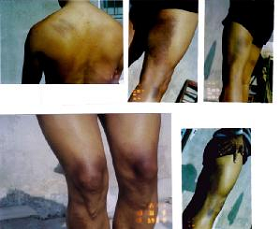 二零零五年十月二十一日,耿怀浦在乌鲁木齐遭绑架,被非法关押进六道弯看守所,被警察、犯人“洗澡”迫害(在寒冷的天气里往身上浇大桶凉水),还被犯人拳打脚踢,全身多处被打伤。五天后,耿怀浦被户口所在地“六一零”带回,十天后闯出。如图为耿怀浦回来十天后的伤情照片。