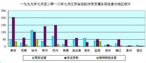 根据明慧网发表的案例所做的不完全统计,一九九九年七月至二零一二年七月的十三年来,江苏省法轮功学员被绑架、骚扰、迫害16000多人次,非法判刑509人次、非法劳教955人次,精神病院及药物摧残200人次,洗脑班迫害2785人次,非法抄家5600多人次,打家劫舍、敲诈勒索(含洗脑班、精神病院勒索)三百多万元,其它迫害六千多人次,包括非法拘留、刑讯逼供、游街示众、开除工职、经济迫害、绑架家属、跟踪监控、电话窃听、监视居住等等。