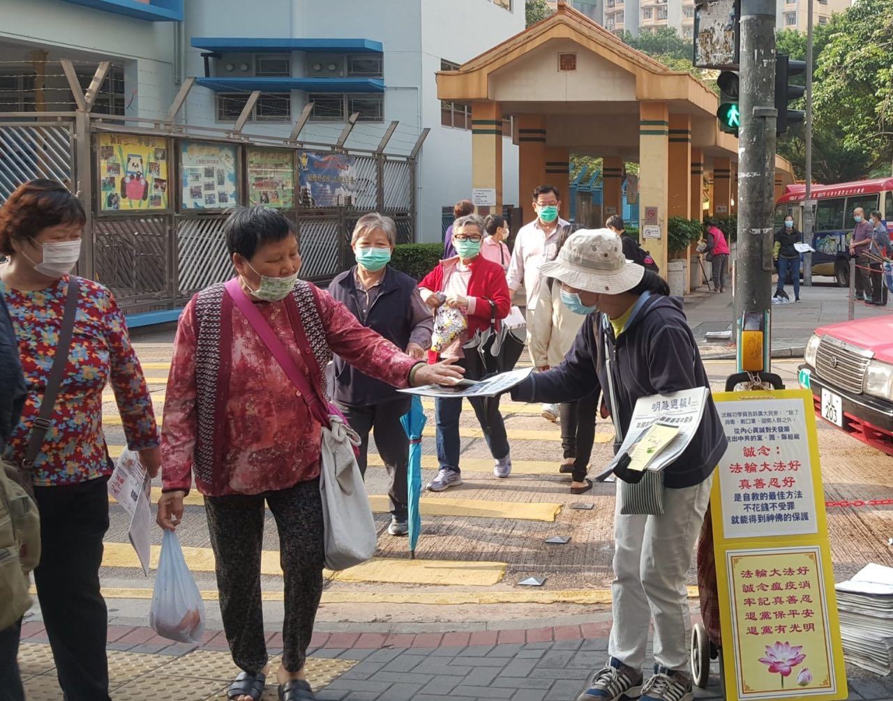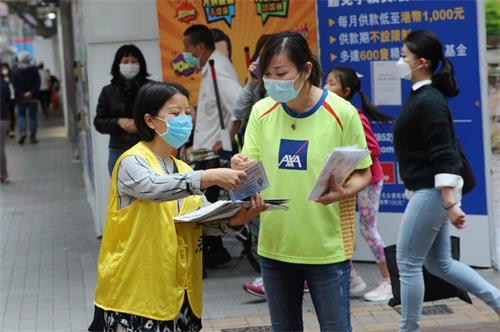 在中环派发资料的法轮功学员周小姐说,疫情下很多民众都很彷徨,人与人之间变得冷漠。“为让更多民众知道法轮功是什么,法轮功所遭受的迫害,为什么法轮功学员要坚持长年累月,给市民讲真相,其实我们想传递一个讯息,希望人们可以记得‘法轮大法好、真善忍好’,避开这场瘟疫。”
