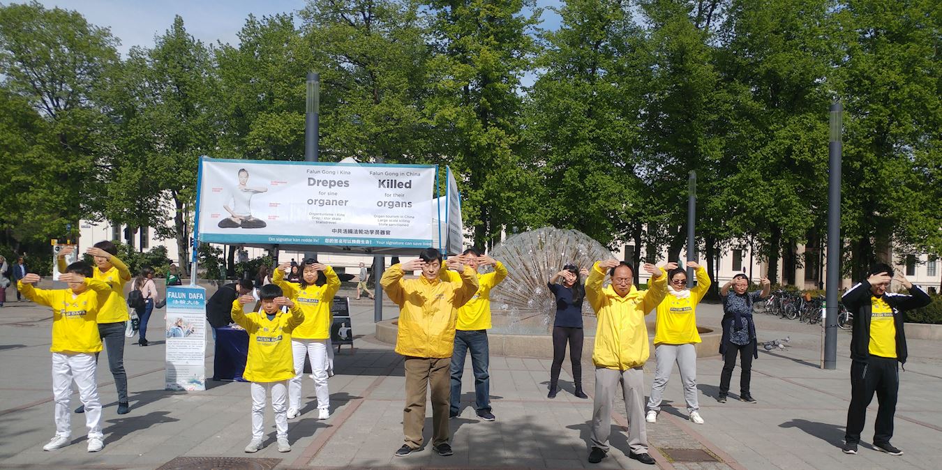 ![]() 图4:五月九日,挪威法轮功学员在国家剧院附近展示法轮功功法 |
