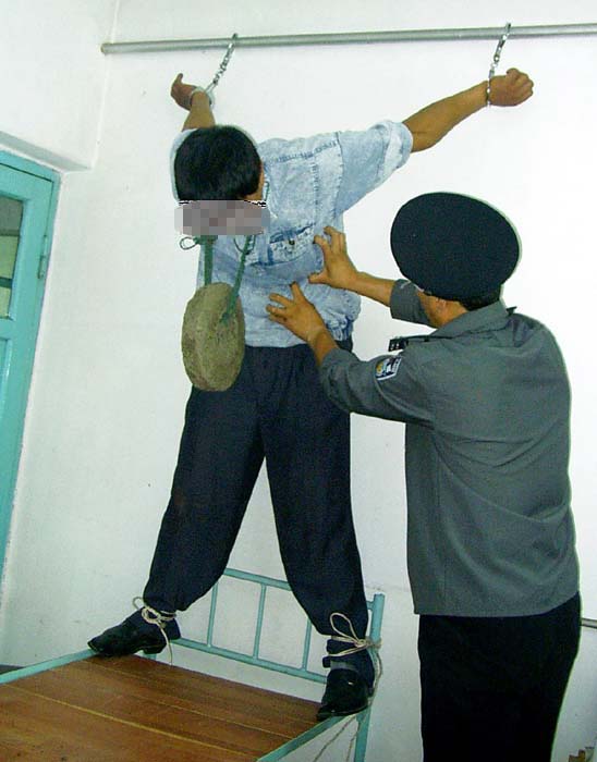 ![]() 中共酷刑示意图:吊铐、挂重物 |