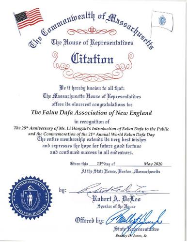 【明慧网二零二零年五月二十四日】二零二零年五月,在第二十一届世界法轮大法日及法轮大法传世二十八周年之际,美国麻州众议院颁发褒奖。