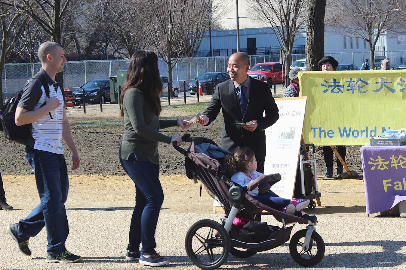![]() 图3:华盛顿DC法轮功学员在向过往行人讲述真相。 |
