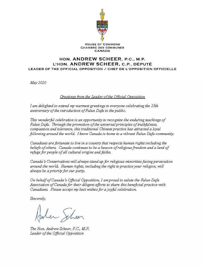 加拿大联邦反对党领袖、保守党国会议员安德鲁·希尔(Andrew Scheer)向法轮大法学会发出贺信表示:“我很高兴向所有参与法轮大法传世28周年庆祝的各位致以我最热忱的问候。”