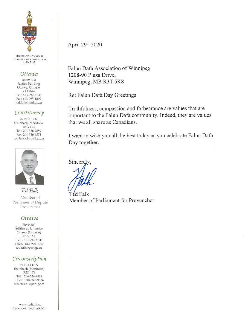 温尼伯国会议员泰德·福克(Ted Falk)致信温尼伯法轮大法协会:真善忍是法轮大法社群的重要价值观,也是我们所有加拿大人共同推崇的普世价值。在共贺法轮大法日之际,送上我深深的祝福。
