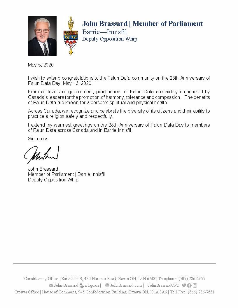 巴里的国会议员约翰·布拉萨德(John Brassard)在法轮大法28周年法轮大法日到来之际,向法轮功社区表示祝贺。