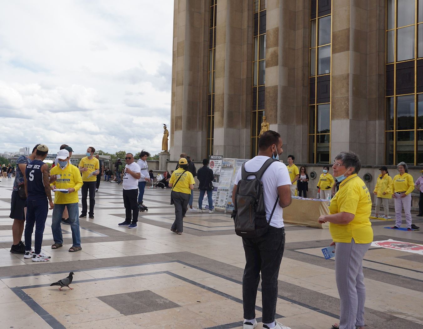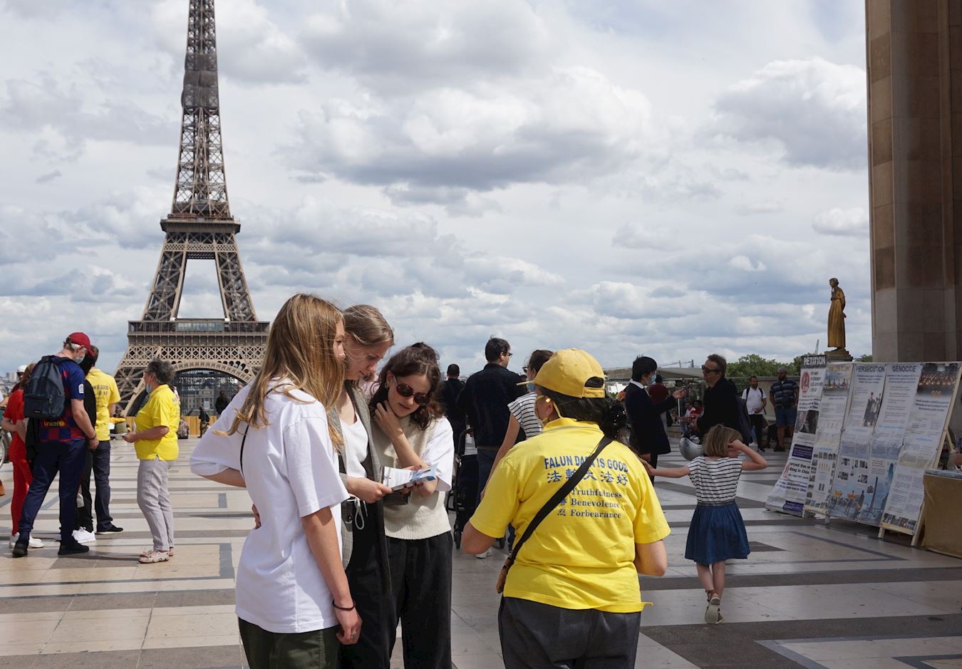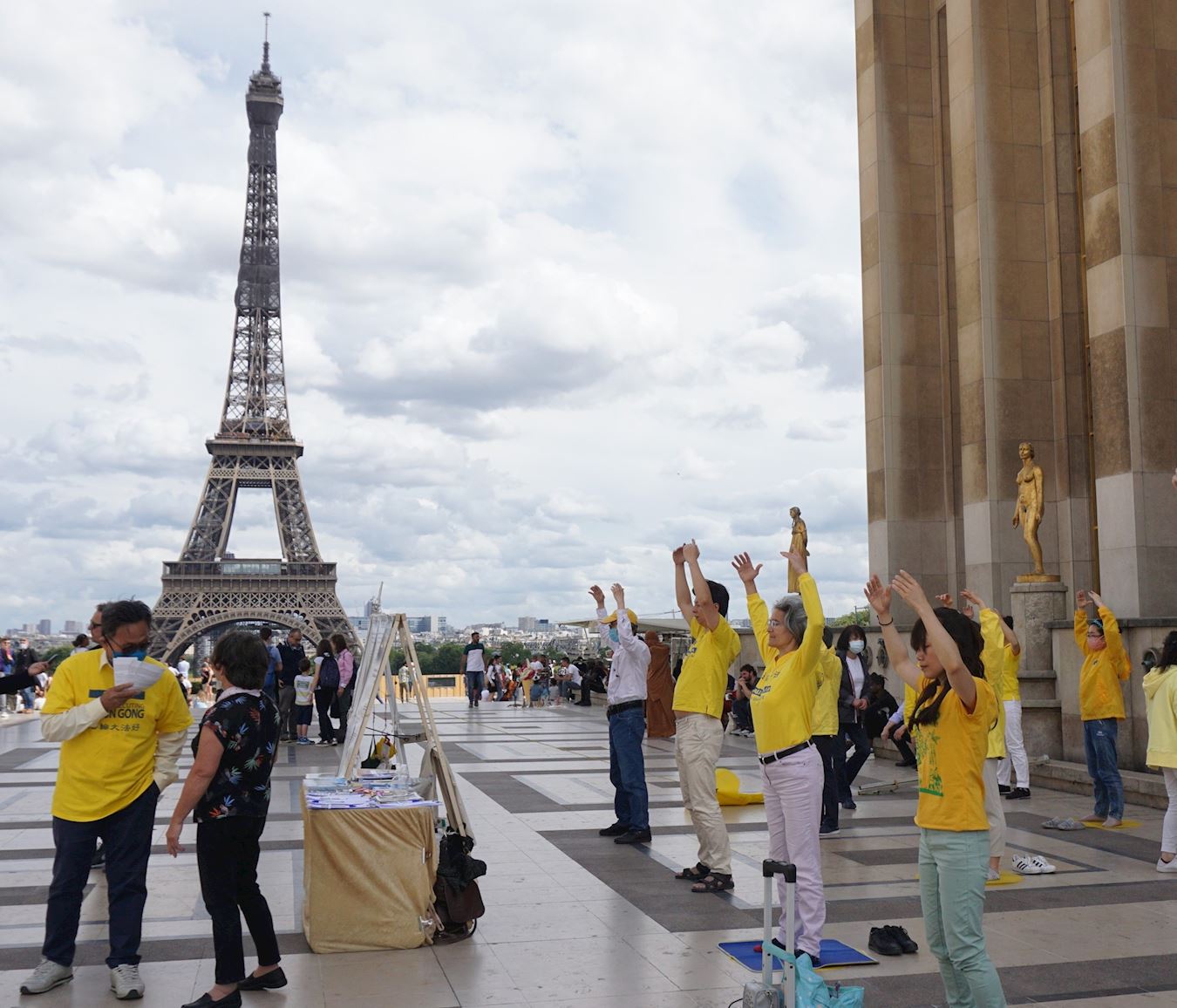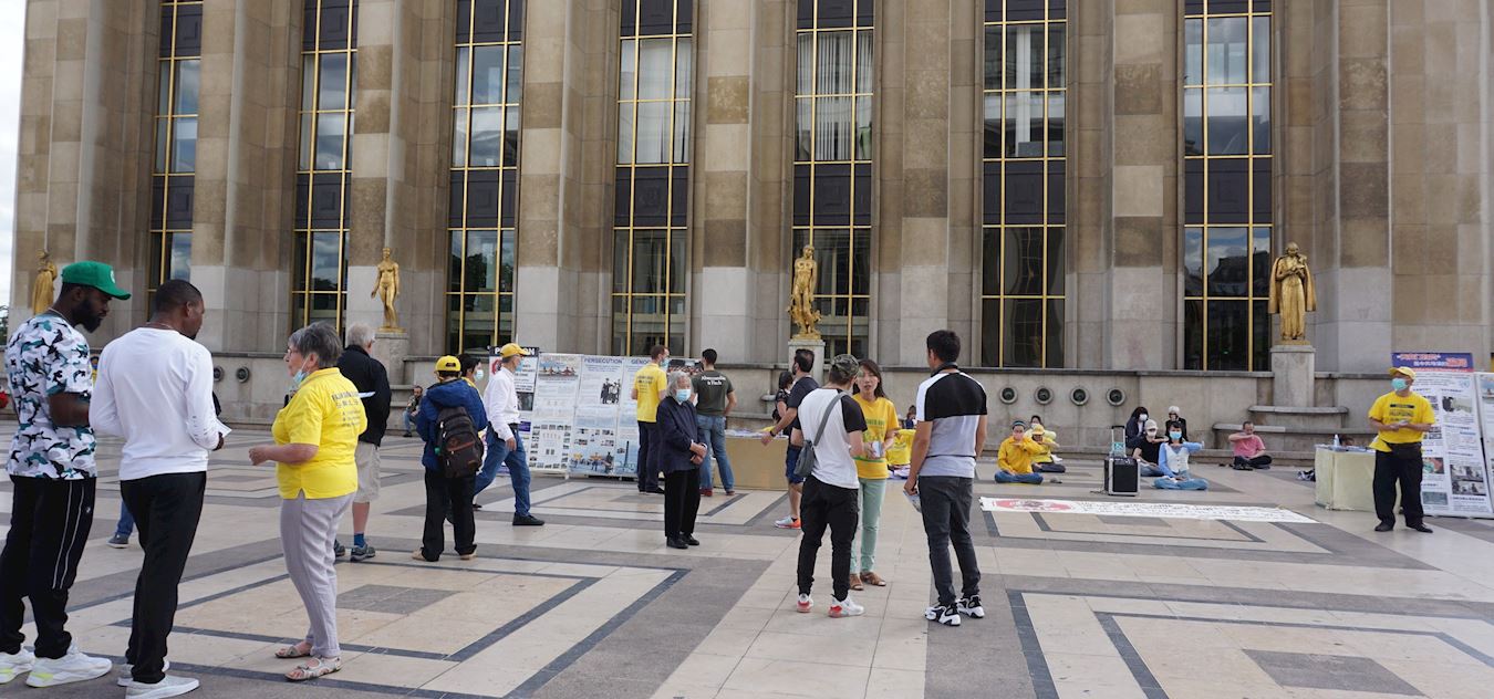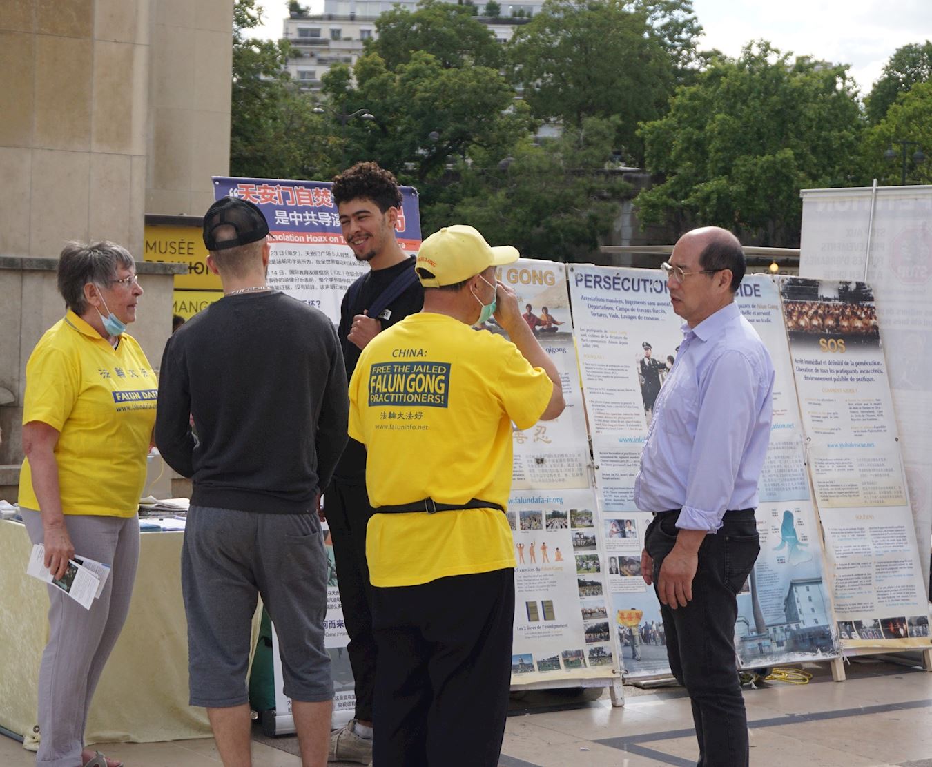 一位住在摩洛哥来巴黎探亲的女士碰巧和一位大法弟子同乘一趟公交车,当她得知这位大法弟子要到人权广场讲真相后,非常感兴趣,竟一路跟过来,当即在现场学习了五套功法的动作,并在法轮功学员反迫害的征签表上签名,离开时还带走了相关资料,表示回去要进一步了解法轮功。