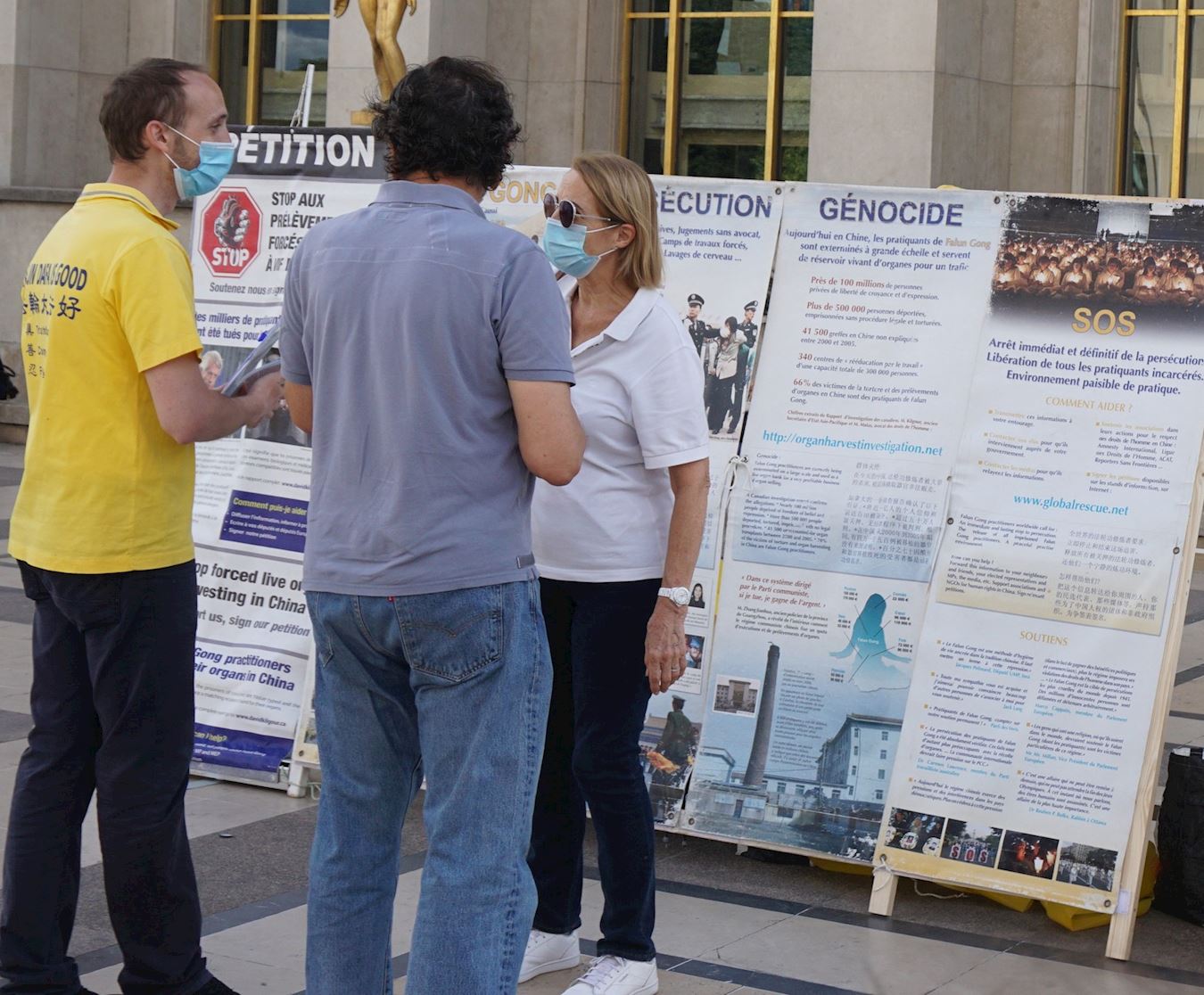 住在大巴黎地区,还在大学读书的卢内斯(Lounes)兄妹俩都在征签表上签名了。妹妹伊内斯(Ines)说:“你们的活动展示的信息很多,用很多的图片来说明,很清晰明了。虽然我不懂中文,但是采用这种中法文对照的方式我觉得很好。这些炼功者首先都是人,他们竟然不经本人允许被强行摘取器官,太恐怖了。正常情况下,人体器官是由本人捐献的,不能强行获取。”