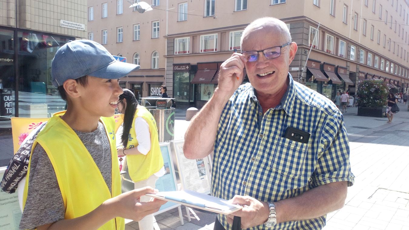 年轻小伙子友希(Jussi)告诉学员,几年前在深圳出差期间,他和他的同事工作签证被无端取消。“在中国社交媒体都不可以使用,不能触及任何敏感话题。刚开始不知道你们在做什么。后来看到你们穿的黄色衣服上写着法轮大法,才知道是法轮功。所以我要来签名支持你们。”