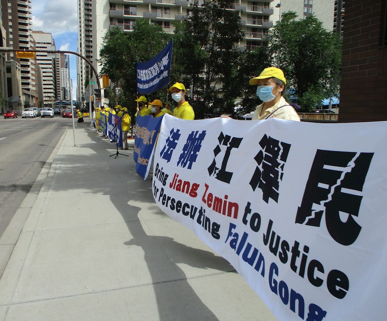 当天,为纪念反迫害21周年,加拿大卡尔加里部份法轮功学员身着黄色T恤在中领馆前集会,中英文横幅沿着马路两侧一字排开。“停止迫害法轮功”、“天灭中共”、“法办江泽民”、“制止中共活摘器官”等标语赢得过往车辆阵阵鸣笛支持,更有不少司机摇下车窗,挥舞手臂,向法轮功学员伸出大拇指。