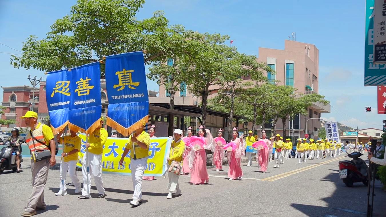游行队伍从金湖篮球场出发,由真、善、忍巨型横幅打头阵,接着美丽的仙女优雅的向金门乡亲挥手,向路人发送莲花吊饰;手持“制止中共、活摘器官”展板的法轮功学员,诉说着中共对法轮功修炼者泯灭人性的迫害,最后气势磅礴、法鼓声声震耳的腰鼓队引导出本次活动主题横幅“天灭中共、结束迫害”,让金门乡亲更加认识中共邪恶本质。