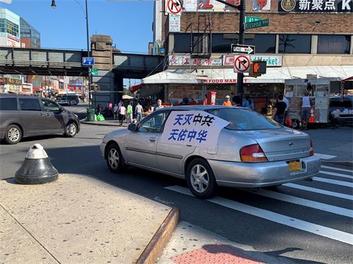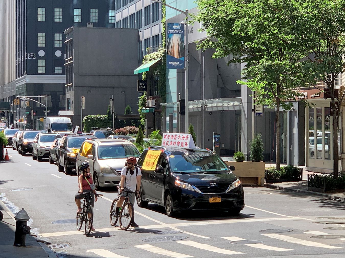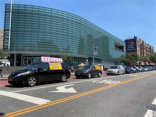 【明慧网二零二零年七月二十日】二零二零年“七·二零”是法轮功学员反迫害二十一周年,七月十八、十九日周末两天,纽约法轮功学员组成“真相车队”环绕三大华人社区和中领馆,告诉世人“中共是最邪恶病毒,祸害全世界”、“拒绝中共,远离瘟疫”,沿途所到之处,吸引不少路人拍照,并向车队竖起大拇指表示赞许。