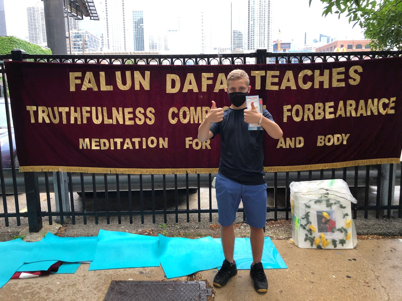 年轻人麦特(Matt)读了真相资料后非常赞同“真、善、忍”。他表示坚决支持芝加哥学员在领馆前的反迫害活动,联想到正在美国肆虐的中共病毒,对法轮功揭露中共的邪恶,他竖起双手的拇指。