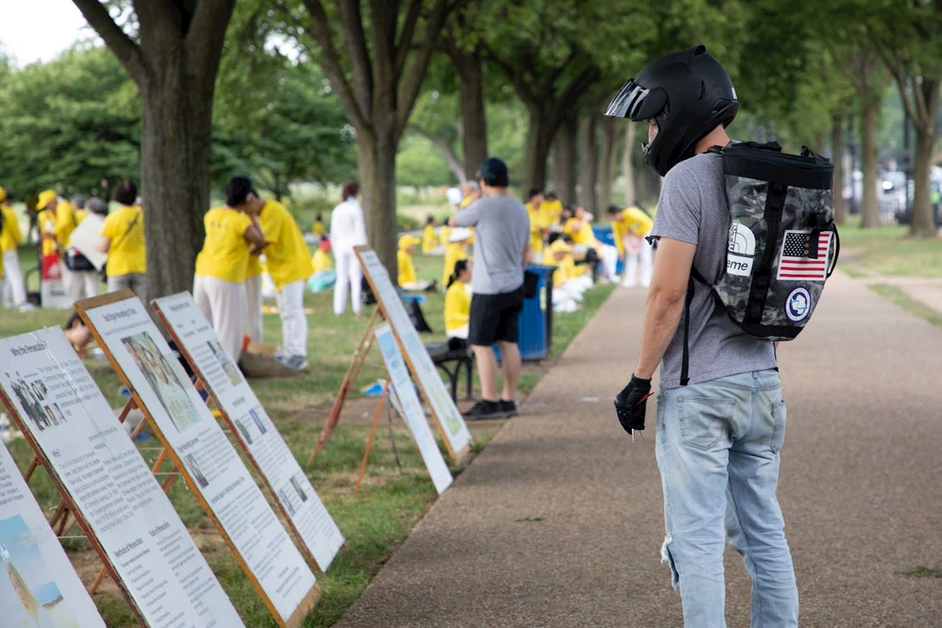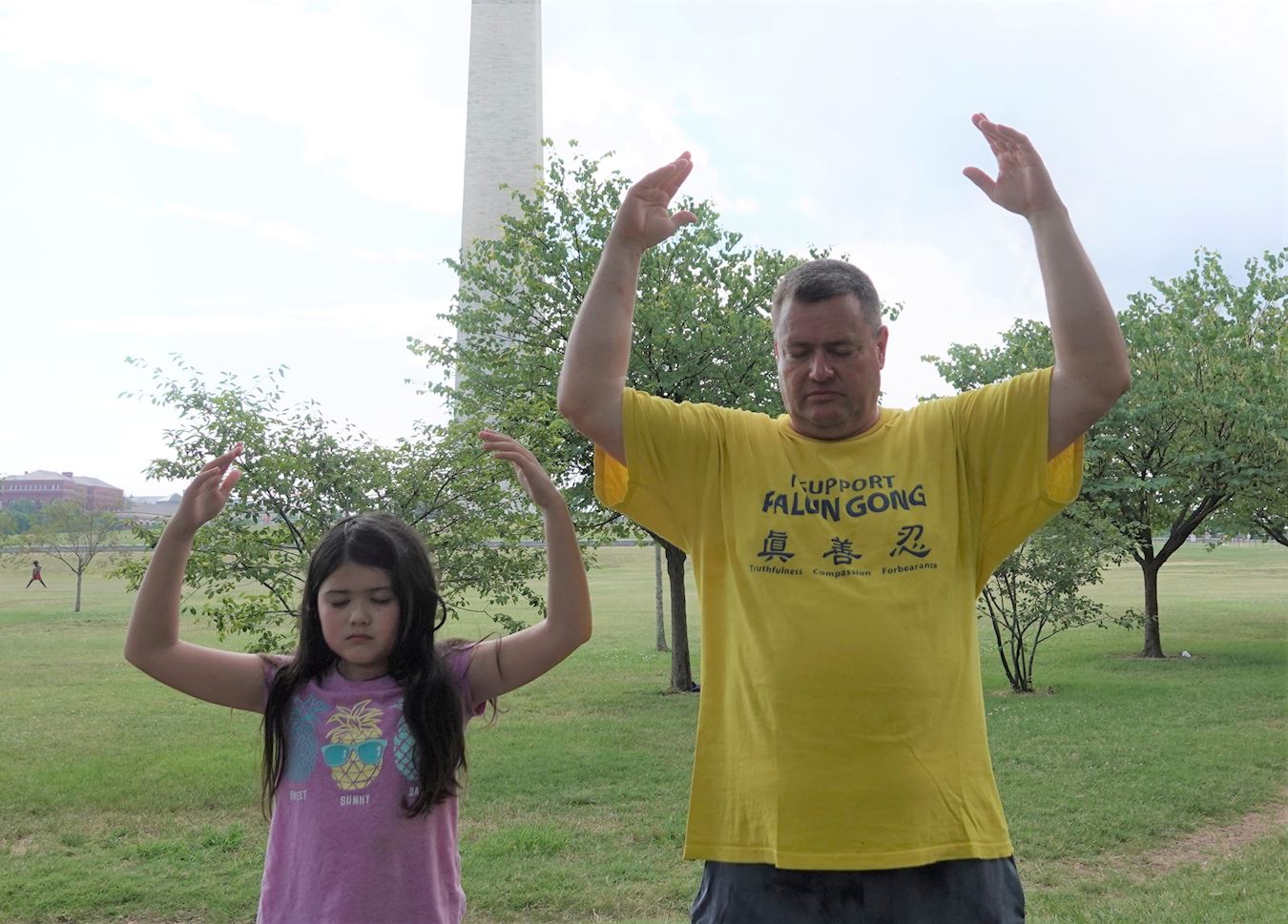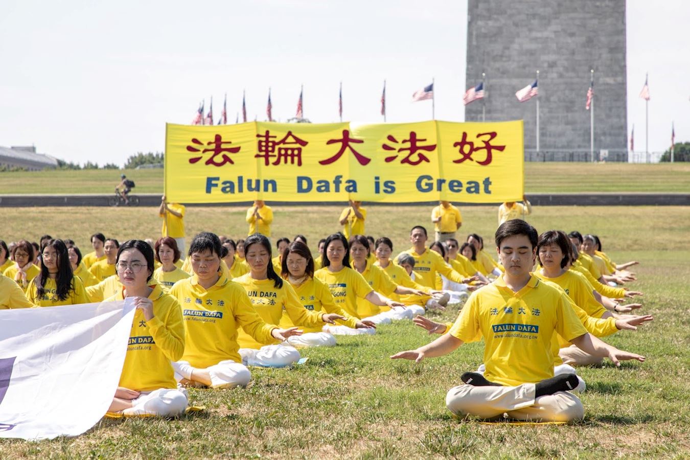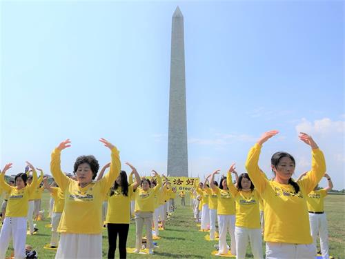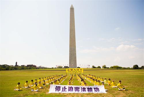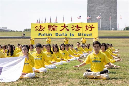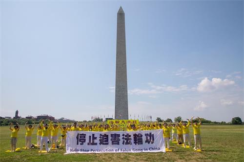 华盛顿的七月酷热难耐,法轮功学员顶着烈日炼功,有的学员手持“法轮大法好”,“停止迫害法轮功”横幅,静静传递着他们的心声。他们当中有很多人年年来参加华盛顿的反迫害活动,走过了二十一年,昔日的莘莘学子如今已步入知命之年,当年的中年人现已年逾古稀;有些人因坚守“真、善、忍”信仰,向民众传递真相,在中国大陆身陷冤狱,遭受迫害。一些西方人也加入了炼功的人群,修炼大法带给他们健康和快乐,他们希望大洋彼岸的中国大陆法轮功学员也能自由地修炼。