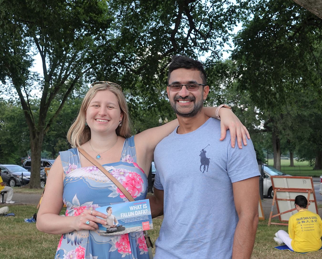 “他们太高贵了,所以我们过来一探究竟”,来自佛罗里达州的两位游客蔚山(Jweshan)和希尔(Shea)被法轮功学员集体炼功的场面吸引过来。第一次听说法轮功的蔚山说,他们已迫不及待想浏览法轮大法网站,了解更多,我们要了解更多迫害真相,尽我们所能帮助他们。希尔补充说:“我知道中共限制信仰,但不知道程度如此严重。‘真、善、忍’是普世价值,我们在生活中都应遵循。”他们感谢法轮功学员告诉他们真相。