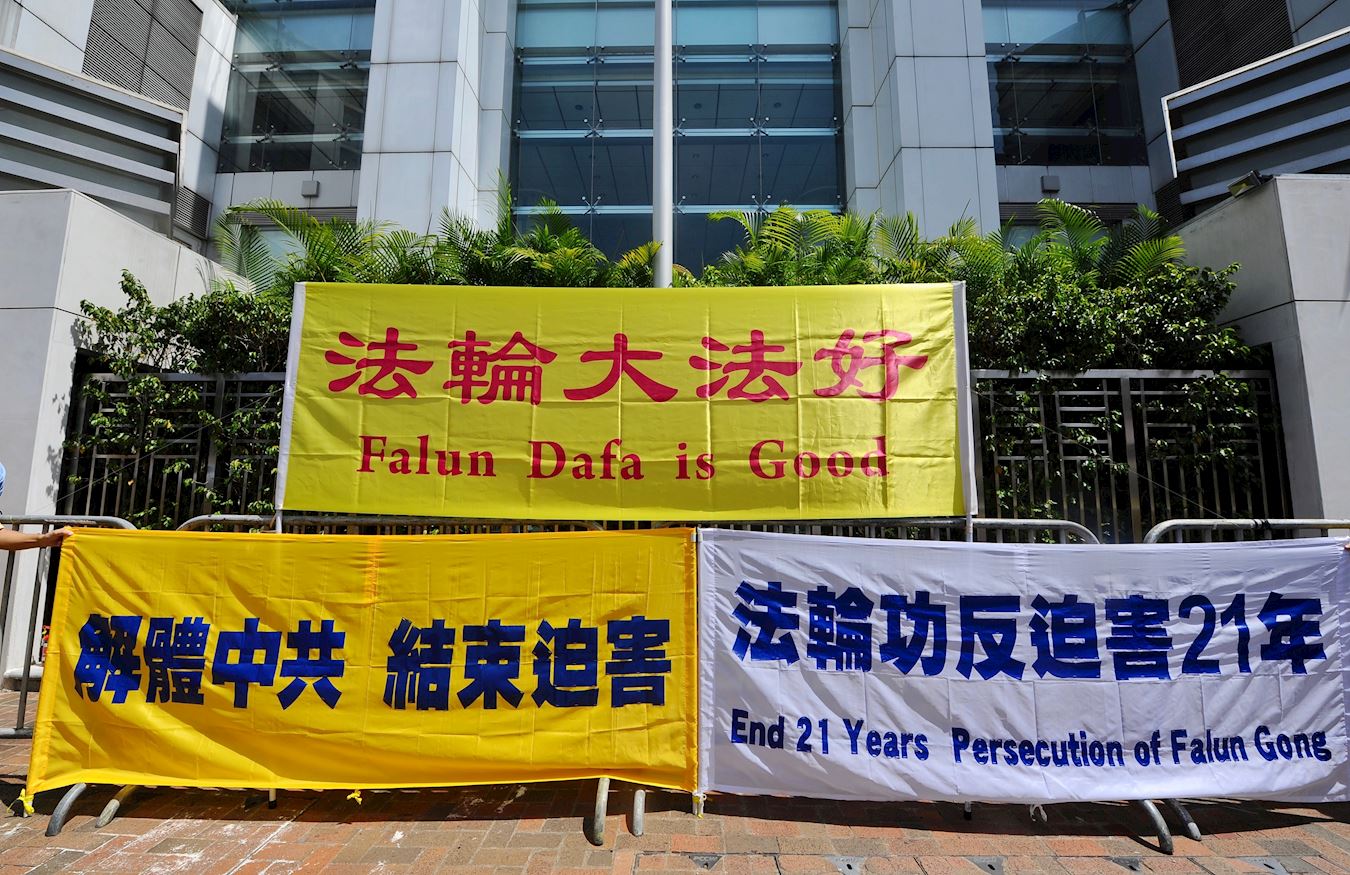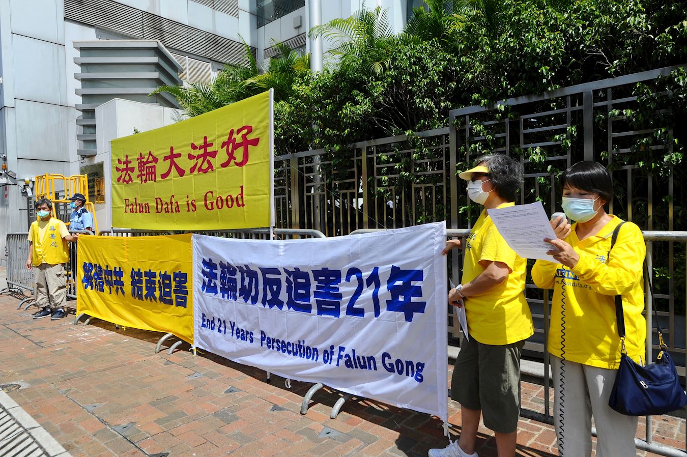 由于中共病毒再度在香港爆发,按照限聚令要求,四名法轮功学员代表,下午从中联办后门游行到正门,并在中联办前拉起“解体中共、结束迫害”、“法轮大法好”、“法轮功反迫害21年”横幅,并宣读声明,之后和平散去。