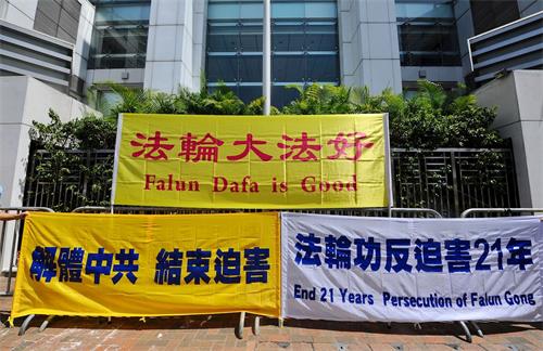 法轮功学员代表刘慧卿宣读声明,声明指中共对法轮功持续二十一年的迫害,被视为廿一世纪最深重的恐怖。面对这场前所未有的邪恶迫害,法轮功学员进行了史无前例的和平抗争。虽然中共政府强行实施“港版国安法”,但香港法轮功学员仍坚持向民众讲清真相,呼唤良知,同时呼吁解体中共、停止迫害。