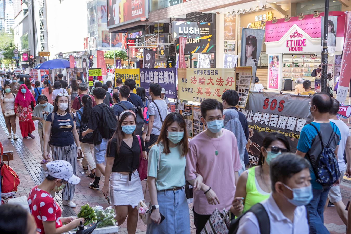 ![]() 图5:七二零反迫害二十一周年,香港法轮功学员无惧国安法,遍地开花讲真相。图为旺角真相点,法轮功学员继续打出“天灭中共”、“停止迫害法轮功”等横幅。 |