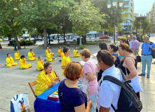 由于中共病毒引起的疫情,希腊仍有很多的限制,但仍有很多希腊人来到市中心。经过信息台时,人们随着广场上传出的优美祥和的炼功音乐,驻足关注这群身着黄色炼功服的法轮功学员们祥和的炼功动作,观看法轮功学员被迫害的真相展板,了解法轮功学员被强行活摘器官的违反人权的暴行真相。呼吁人们携手反对中共邪恶的暴行,结束迫害。