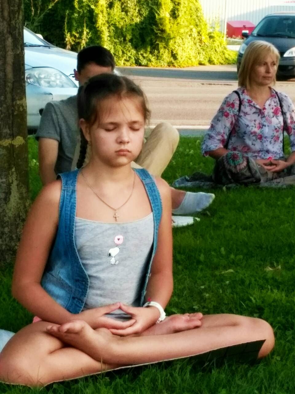 一个十多岁的女孩和他的父亲一起沿着河堤散步。当她看到学员们炼静功的场面,她也想打坐。于是一个学员给她铺开垫子,告诉她正确的功法动作,女孩遂即坐下双盘,随着音乐打坐。打坐结束后,她问法轮功是否还有其他功法?学员为她演示了动功动作,并赠予她小莲花,上面的挂坠印有大法网址,告诉她回家后可登录网站,上面有教功录像和书籍,可以自由学炼。
