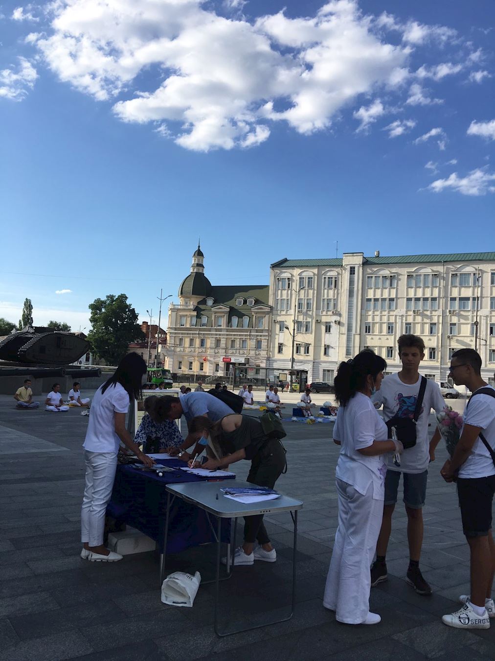 七月二十日,哈尔科夫市部份法轮功学员们举行二十一周年反迫害,讲真相活动。